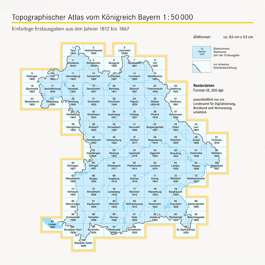 Das erste Großprojekt der Bayerischen Vermessungsverwaltung ist der „Topographische Atlas des Königreiches Bayern“ im Maßstab 1:50 000. Er wurde vom Topographischen Bureau erarbeitet und entstand in der Zeit zwischen 1801 und 1867. Einschließlich Titelblatt und Übersichtsblatt mit Zeichenerklärung umfasst das im Kupferstich herausgegebene Kartenwerk 112 Blätter. Der Atlas gibt das Königreich Bayern flächendeckend wieder und enthält die Gebiete des rechtsrheinischen Bayern und der Pfalz.